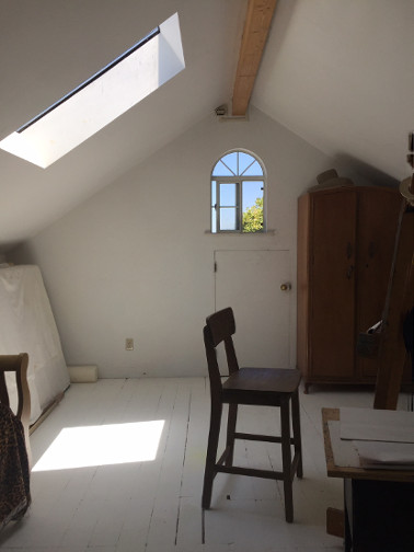 Monks Hack works in a light-filled attic studio in the same cottage where she and her husband Wyn raised their four sons. Monks Hack is currently focused on “Patchwork,” a series of oil paintings on pieced and sewn canvas.